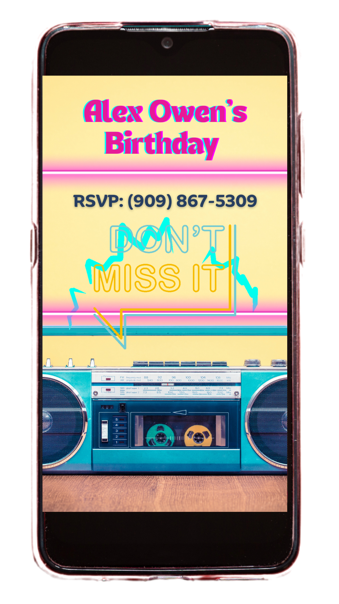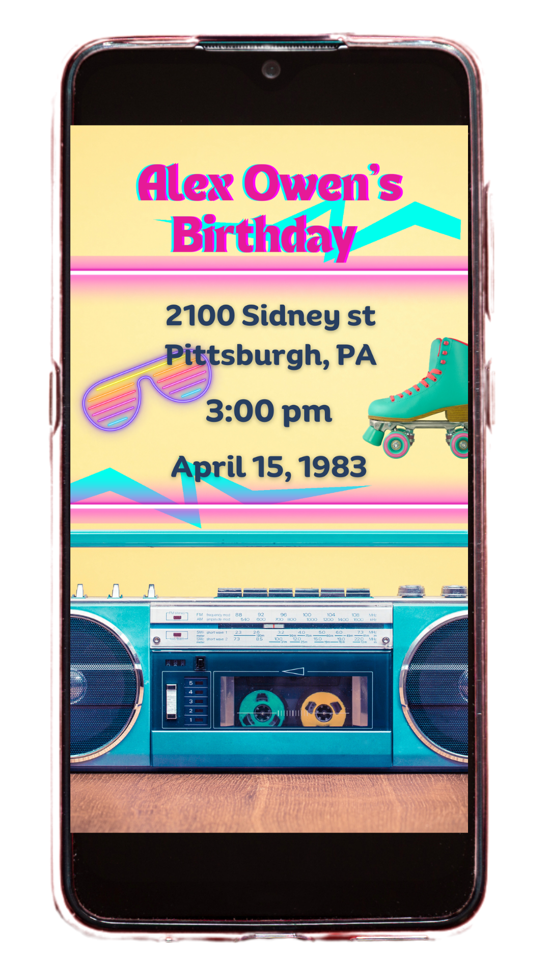 This digital invitation is a blast from the past, brimming with vibrant colors and playful nostalgia. The background is a kaleidoscope of neon pinks, electric blues, and zesty purples, bringing the 80's vibe to life. This template captures the fun, flirty, and fabulous energy of the 80’s. It's perfect for a girly, upbeat celebration filled with neon, sparkles, and the best of the 80’s music and fashion.