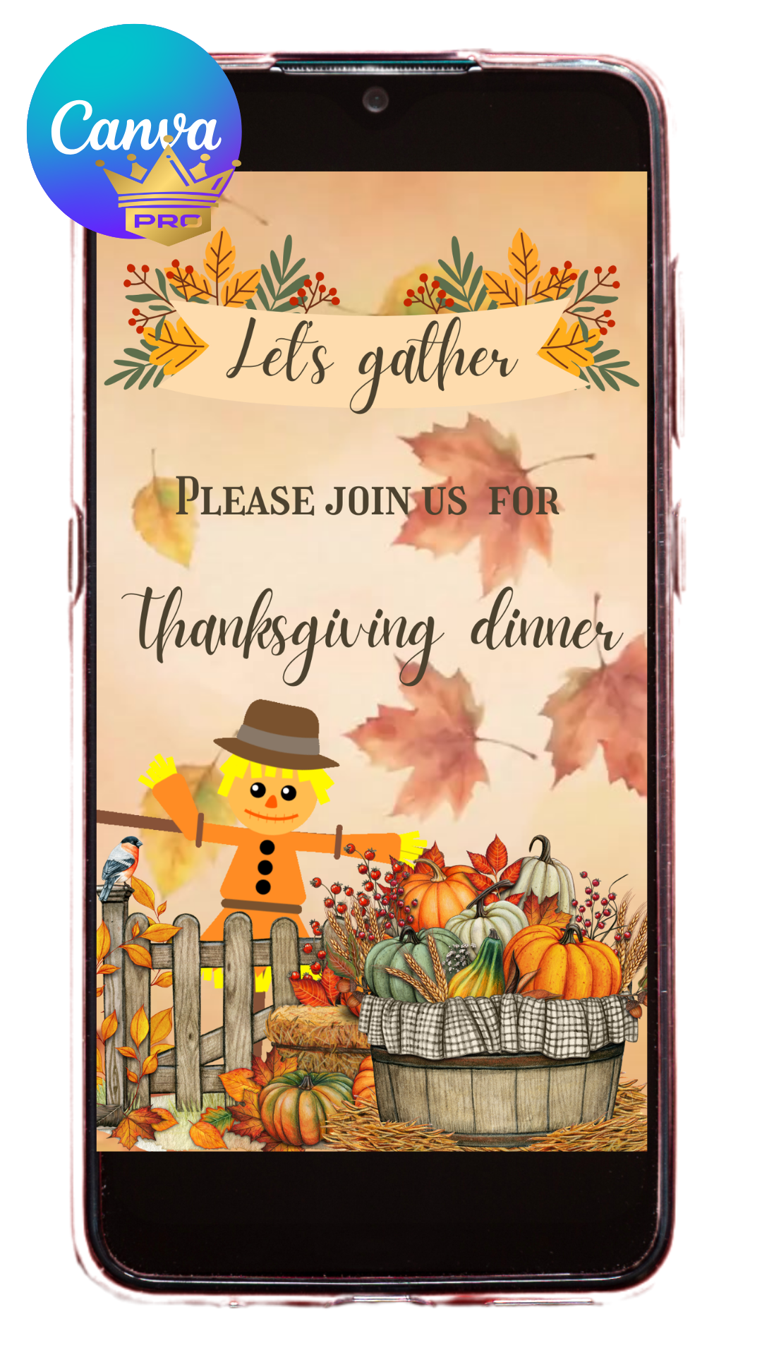 Set the perfect tone for your Thanksgiving dinner with this video invitation TEMPLATE! Featuring a friendly scarecrow and highlights a beautifully set traditional Thanksgiving dinner surrounded by autumnal details. As falling leaves gently drift across the screen, the warm colors of fall bring the cozy atmosphere of the season to life. The inviting, heartfelt design captures the spirit of gratitude and togetherness, making this video invite the perfect way to gather loved ones for a memorable Thanksgiving celebration.